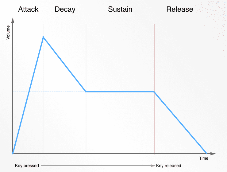 This is a key aspect of how a synthesiser will sound. In short, the ADSR envelope determines how quickly the volume of a note increases when the piano key is first hit, how the sound decays away while the key reamins pressed, and finally, how quickly the sound dies away once the key is no longer pressed.
