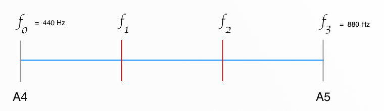 Lets see if we can figure out a system for calculating the note frequencies for each semitone. Lets imagine a simpler octave that only has two semitones, what would be the frequency of our imaginary note f1?